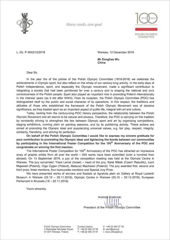 波蘭國家奧林匹克委員會主席安德烈·克拉斯尼基(AndrzejKra?nicki)親筆簽名并頒發獲獎證書