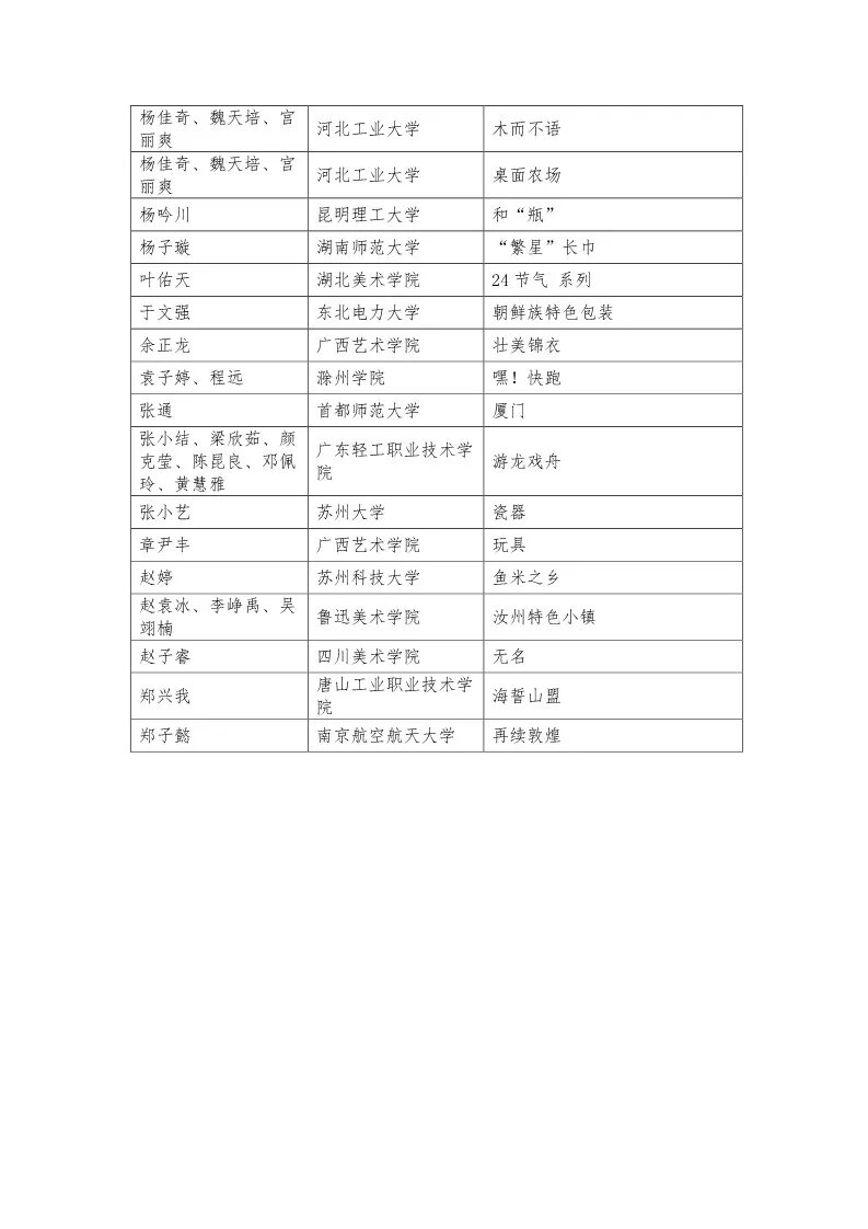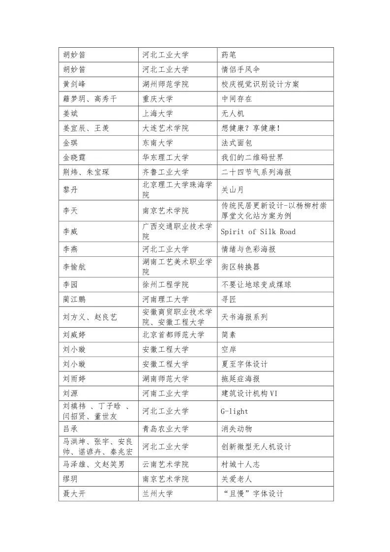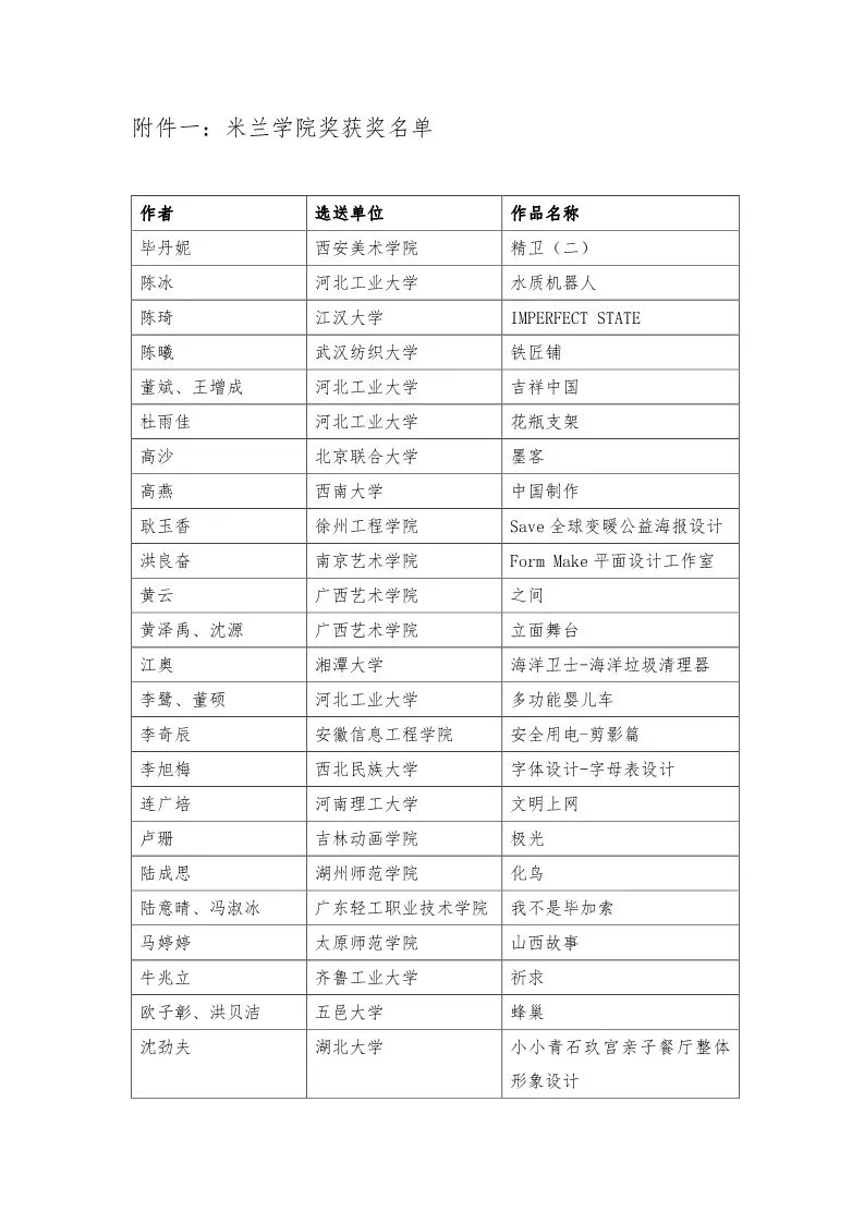 首頁 > 資訊 > 正文 資訊 設計訪談 設計賽訊 藝術名家 青年藝術家 視頻 素材教程 藝術展覽 設計志 2018米蘭設計周中國高校設計學科師生優秀作品展獲獎名單公示 發布: 2018-04-09 00:00 | 作者: | 來源: 設計·中國 2018米蘭設計周 中國高校設計學科師生優秀作品展 獲獎名單公示 “2018米蘭設計周-中國高校設計學科師生優秀作品展”,將于2018年4月10日—5月2日在米蘭理工大學進行展出。自今年2月發布通知以來,收到了全國200多所藝術高校的三千余件投稿作品。本著公平、公正、公開和鼓勵參賽的原則,經過初選和終選,共評選出了學院獎(45件)、優秀獎(97件)、入圍獎(161件)及優秀組織單位獎(50家)。 現將獲獎有關情況予以公示如下: 學院獎 優秀獎 入圍獎 優秀組織獎 (編輯:朱夢楠)