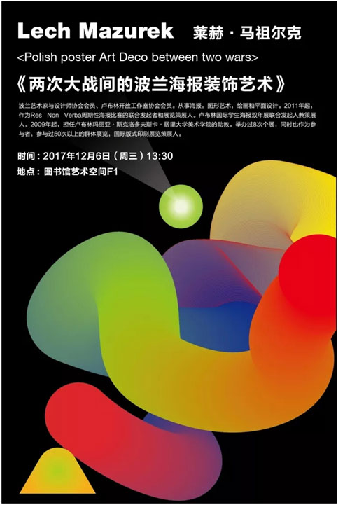 12月6日,“波蘭先鋒”展開幕式當(dāng)天,在圖書館藝術(shù)空間將安排三場精彩的藝術(shù)講座,主講人分別為參展的兩位波蘭藝術(shù)家塞巴斯蒂安·斯密特、萊赫·馬祖爾克以及本次展覽的學(xué)術(shù)統(tǒng)籌——來自北京印刷學(xué)院的許力老師,三位將重點(diǎn)介紹波蘭海報(bào)及平面設(shè)計(jì)風(fēng)格并回顧波蘭海報(bào)設(shè)計(jì)展40年的發(fā)展歷程。