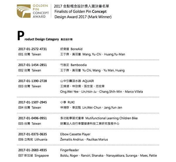今年臺(tái)灣地區(qū)的晉級(jí)作品中,充滿濃厚的人文關(guān)懷。王于齊、黃羽蔓以“好骨道”、“竹肢足”一口氣拿下2項(xiàng)標(biāo)章,“好骨道”為簡易骨折固定器具,可依照不同折法應(yīng)用在不同的受傷部位,提升緊急救難效率、“竹肢足”則是一款低成本義肢,踝關(guān)節(jié)運(yùn)用竹材的彈性使行走上不費(fèi)力。王煒堉、林欣儒、張世旻、范宏章的“山中引霧汲水器”,透過引霧、離心甩水的方式取得大氣中的水,借此改善缺乏干凈飲用水地區(qū)的困境。梁晉瑋、詹郁柔、宋曉其、高羽薇的“點(diǎn)面”,是一款方便視障者購買及操作泡面的設(shè)計(jì)。曾品喬、蔡孟書、柳育琪、許子甫、王瑋凡、林顥庭的動(dòng)畫片“奈可”,描述主角在貓咪身上的虛擬城市與惡蟲對(duì)抗,試圖傳達(dá)寵物健康防疫觀念,創(chuàng)意十足。施博瀚的字體設(shè)計(jì)“凝明朝體”,結(jié)合明體與楷體的優(yōu)點(diǎn),最大特色在于橫劃末端有如凝霜般翹起,帶有可愛、明快之感又不失優(yōu)雅。