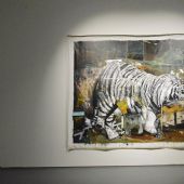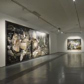 宋朋作品中的大量圖像挪用自影像與攝影中出現過的歷史人物與新聞事件,藝術家如同一個起義者,對于一些特性顯著的歷史形象,往往使用一種接近黑白或單色圖像的介入方式,形成對圖像原有意義的遮蔽或否決。宋朋的畫面時常顯露一種空間縱深感,這或許來源于他的建筑學背景,他將人、事、物錯落有致地置入畫面空間,融入人造光線,制造出強烈的劇場真實。