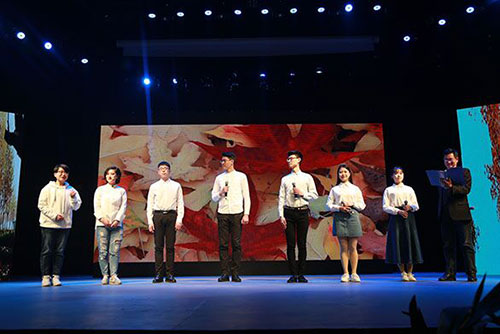 濮存昕與主持人以訪談的形式,暢談自己對藝術、傳統文化、戲劇、公益等的看法。“天曉不因鐘鼓動,月明非為夜行人”表達了他對藝術最純真、最本質的追求。濮存昕提到自己從小就對表演有濃厚的興趣,但由于受制于時代,沒能接受全面系統的專業學習。他希望借自己的經歷勉勵同學們堅持夢想,絕不因外界條件而輕言放棄。對于傳統文化,他表示我們要有自信,并鼓勵山東工藝美術學院的學子,用專業優勢,推動傳統文化保護。作為“預防艾滋病”愛心大使,濮存昕老師在現場談起之前的艾滋病公益事業,用他的行動在舞臺、在社會上釋放著正能量。他告誡同學們尊重艾滋病患者的存在,“工藝人”也要做公益人,做公益事。應用設計學院MASK話劇社帶來話劇《李白》,濮存昕對同學們地付出給予充分肯定和鼓勵,并進行現場點評。在互動環節,他現場為同學們答疑解惑,結合自身經歷就大學生情感等話題,鼓勵青年人不斷努力,奮發向上。他與學校廣播站的同學們共同朗誦《她的四季》,聲情并茂的朗誦,為學校獻上一份最真摯的祝福,博得現場陣陣掌聲。最后濮存昕朗誦詩人郭小川的《祝酒歌》作為青春寄語送給在座的大學生。整場活動在熱烈的氣氛中結束。