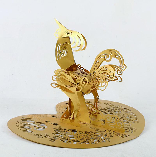 獲得平面設計類組委會特別獎的作品名為“Super 吉”,作品以愛的手勢表達雞的形態以及新年時節的精氣神。剪紙作品“高歌”則獲得了產品設計類的大獎,設計師巧妙利用立體剪紙手法,使作品展開后成為一只挺拔的金色雄雞躍起,寓意雞鳴喜報,歡啼盛世。