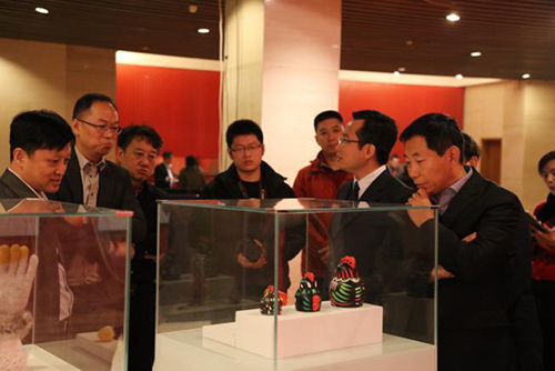 嘉賓正在觀看產品設計單元優秀設計獎:中國民間泥塑套裝系列“四雞吉祥”。