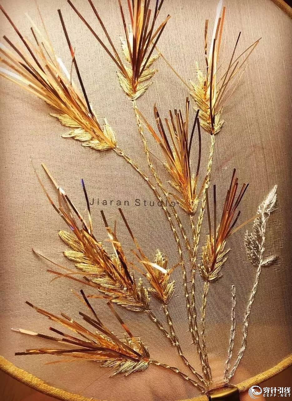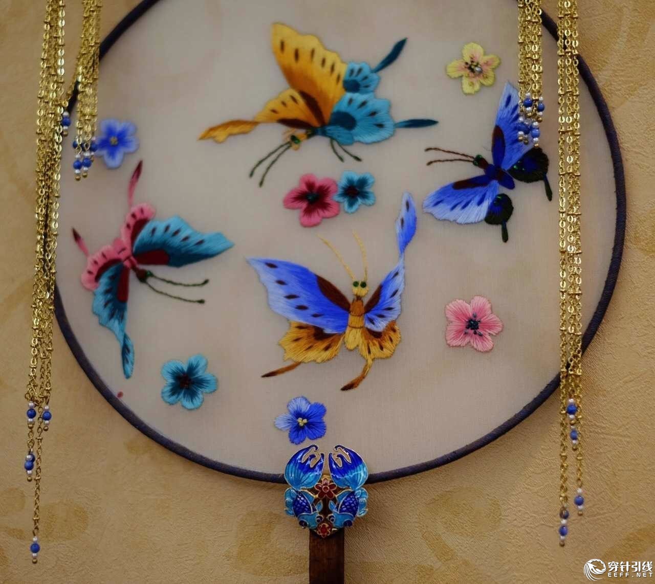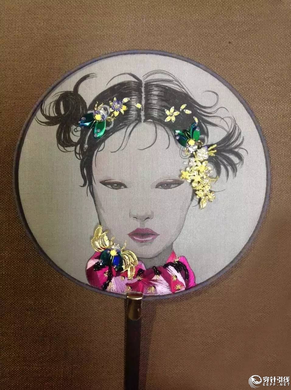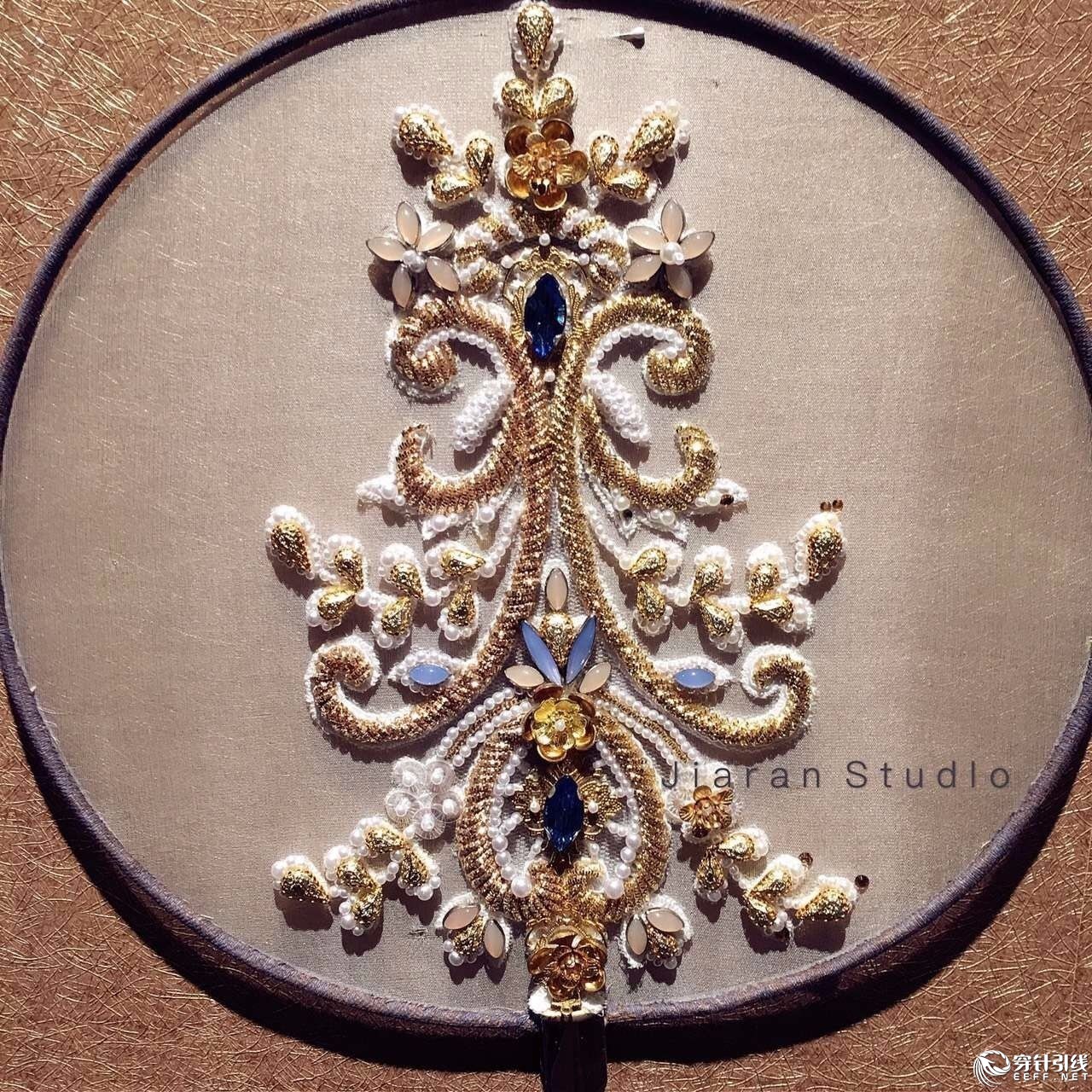 △金屬、寶石、珍珠繡于扇上,珠圍翠繞。