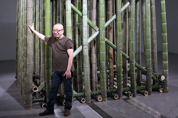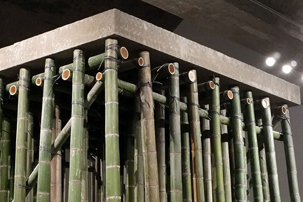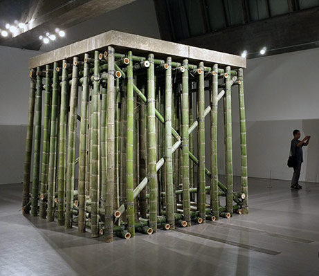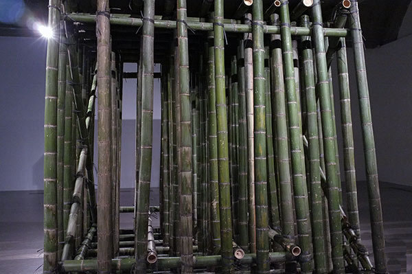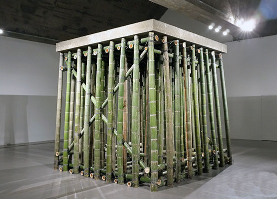 蕭昱作品《水泥樓板》中被捆扎的青竹矩陣