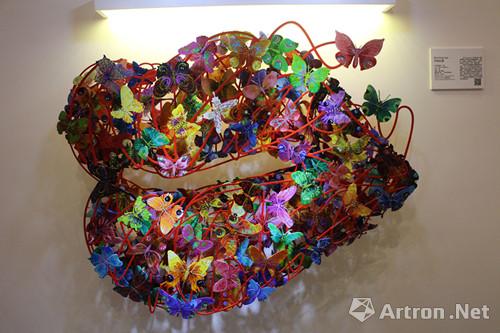 位于商場(chǎng)中的展覽,明顯的個(gè)人風(fēng)格吸引了許多觀眾的關(guān)注。這次展出的作品之一《烈焰紅唇》,繽紛的蝴蝶以不同的姿態(tài)嬉戲于紅唇上,“在歐美蝴蝶代表著最美好的祝福,有一個(gè)古老的美洲印第安傳說(shuō),結(jié)婚新人把自己的心愿輕聲告訴手中的蝴蝶,然后將蝴蝶放飛,蝴蝶會(huì)告訴精靈和天使,精靈和天使就能讓愿望變?yōu)楝F(xiàn)實(shí),愛的訊息和天長(zhǎng)地久的承諾,從此便恒久不忘?!?/p>