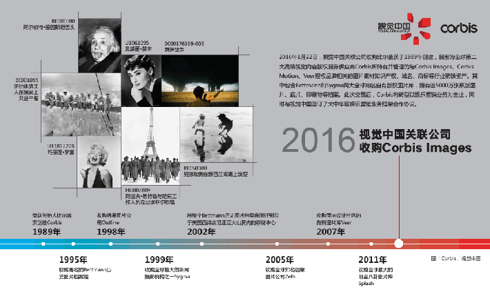 2016年1月22日,中國北京,中國領先的互聯網文化創意上市公司——視覺中國(證券代碼:000681)宣布,其關聯公司聯景國際(Unity Glory)收購Corbis Images的全部資產,這些資產包括:Corbis Images、Corbis Motion、Veer授權品牌相關的圖像庫、品牌與商標。