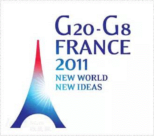2011年G20峰會在法國西部海濱城市多維爾舉行,口號是“新世界、新觀念”。上圖是本屆法國擔任主席國的G20-G8夏季聯合峰會的官方標識(英文版),融合了法國國旗、巴黎鐵塔和太陽光的元素。