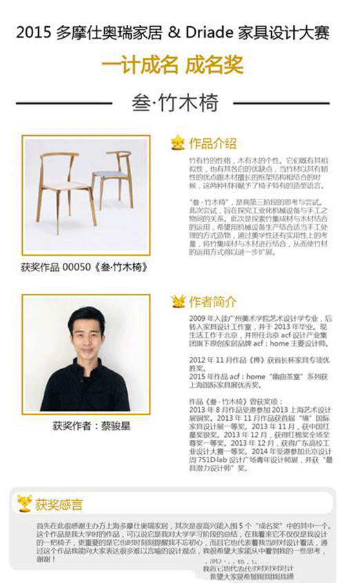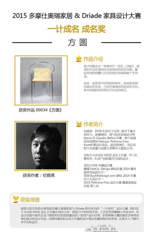 2015年12月中旬,備受中國和歐洲家居及設(shè)計(jì)行業(yè)所矚目的“一計(jì)成名”設(shè)計(jì)大賽大獎揭曉。此次大賽由多摩仕奧瑞家居與Driade聯(lián)合舉辦,歷經(jīng)數(shù)月受到社會各界的廣泛關(guān)注,活動收到來自世界各地眾多華人設(shè)計(jì)師的投稿作品。經(jīng)過專業(yè)評委的嚴(yán)格評選,海選出一百余件入圍作品,并最終誕生了“全場大獎”— 《記憶》 和 5位“成名獎”—《五岳》 《方圓》 《銀杏葉椅》 《叁.竹木椅》 《山河落日》。