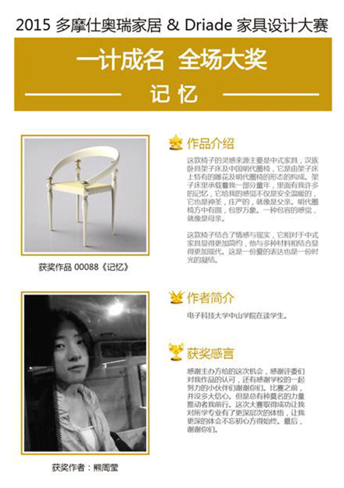 國際知名時尚家居品牌Driade作為“一計(jì)成名”主評委團(tuán)認(rèn)為:“一計(jì)成名”大獎作品《記憶》是所有參賽作品中最成熟的一件,它給人以和諧現(xiàn)代的美感……”