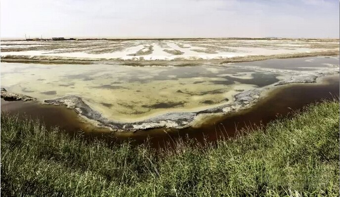 2014年8月29日,內(nèi)蒙古阿拉善左旗,騰格里沙漠深處,一片鹽堿地被附近化工廠直接排放的污水污染。