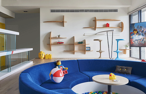 HAO設計工作室利用各種巨型樂高玩具般的體塊改造了臺灣高雄市一棟公寓的室內空間。這處俏皮感十足的生活空間圍繞一個“游戲池”展開,為宅中的年輕家庭提供了一個共享的娛樂空間。