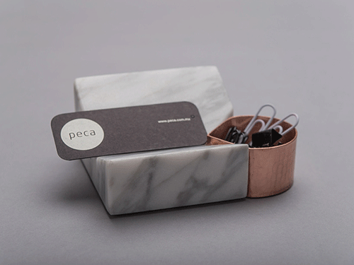 來自于墨西哥的工作室peca studio選擇了大理石與黃銅兩種材料打造了一套名為“santa clara”的系列產品,將莊重與輕松兩種概念放在了一起。這套裝飾性的套裝產品是由兩種不同的大理石制品組成的,它們各自有一個手工捶打而成的黃銅容器。這些多功能的配飾可以放在桌子上,作為紙鎮、卡片或筆架,或是書架上的擋書板,還可以用來放首飾以及私人用品等。