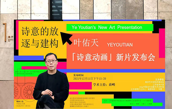 12月11日下午,葉佑天「詩意動畫」新片發(fā)布會暨創(chuàng)作研討會在江蘇省美術(shù)館召開,因受疫情影響活動采取「線上連線+線下」方式同步進行,其時近300名學界重磅專家及南京藝術(shù)學院師生濟濟一堂,共同觀摩了葉佑天四年來創(chuàng)作的六部「詩意動畫」動畫作品。同時,葉佑天教授作了《詩意的放逐與建構(gòu):詩意動畫的體系構(gòu)建、框架、特征、運行與學術(shù)話語》學術(shù)演講,闡述了自己的創(chuàng)作理念及動畫作為中國傳統(tǒng)美學的現(xiàn)代化藝術(shù)表達之路徑等。發(fā)布會由南京藝術(shù)學院薛峰教授線下主持,研討會由中國動畫學年會創(chuàng)始人鐘遠波教授線上主持,線上線下氣氛簡樸熱烈,全程散發(fā)出濃濃的學術(shù)氛圍。