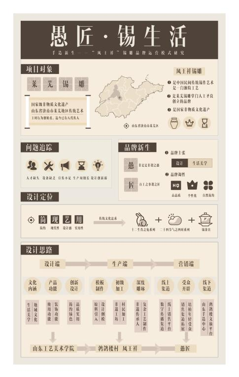 山東工藝美術學院設計學立足博大精深的中華優秀傳統文化,堅守工藝美術品牌,在工藝美術、非物質文化遺產研究、民藝學、創意設計等領域特色突出,并設有同類學科唯一的“泰山學者”崗位。2020年,學校入選山東省高等學校“高水平學科”建設項目“高峰學科”建設名單,并在第五輪全國學科評估中取得優異成績,在上海軟科2017—2022年發布的“中國最好學科排名——1305設計學”榜單中,排名穩居全國前十,2021年位居全國同類學科第五位。該學科下設的藝術設計、動畫、藝術設計學專業為國家級特色專業,視覺傳達設計、藝術與科技等9個專業獲批國家級一流本科專業建設點。該學科積極對接國家和區域發展戰略,促進文化創意產業高質量發展。本屆展覽將對該學科高效服務“黃河流域生態保護和高質量發展”“鄉村振興”“新舊動能轉換”“傳統工藝振興”等戰略,大力參與“中國民間文化遺產搶救工程”“中國工藝美術集成”等重大工程,積極開展“手藝農村”特色產業扶貧計劃、鄉村文化振興“齊魯樣板”研究,精準服務“山東手造”區域公共文化品牌建設,打造產業新動能等方面進行展出。