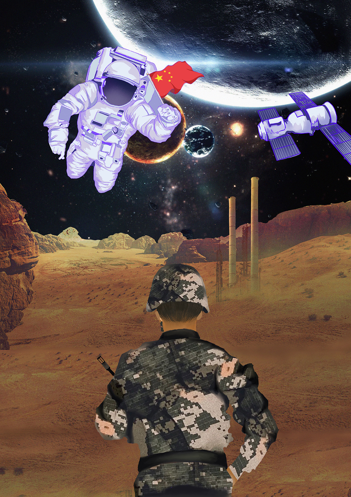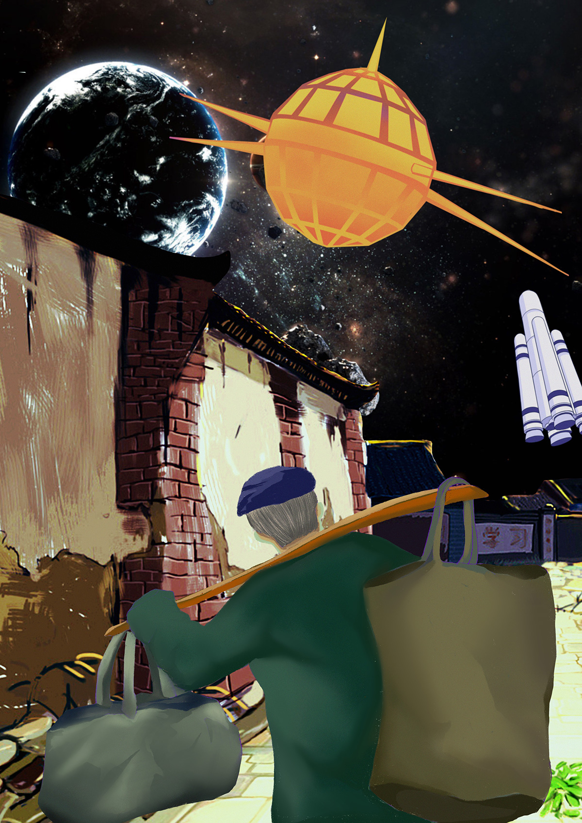 為了紀念1978年至今,中國改革開放進入第三十個年頭,經濟取得的舉世矚目之發展,中國的航空航天事業發生的翻天覆地之變化。創作的系列插畫作品《航空三十年》。回望往昔,中國航天從50年代起東方紅一號的成功發射,到如今載人航天工程和繞月探測工程的蓬勃發展,創作的三張作品,分別以鄉村中的老人、戍守邊疆的青壯年士兵、城市中的孩童這三種視角,帶領觀眾遙望中國的太空探索事業。三個時期,三種視角,三種身處環境,回憶與見證中國航天、中國經濟、祖國綜合國力在短短幾十年間的的巨大變化。