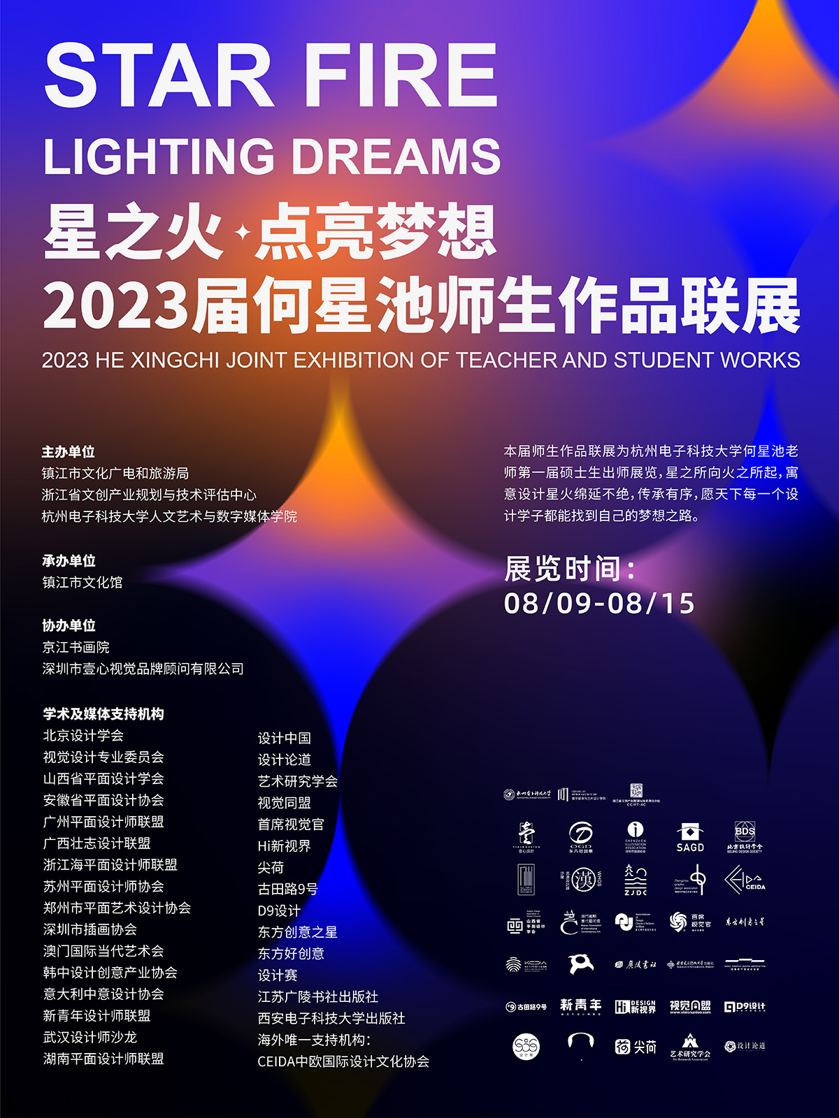 2023年8月9日,由鎮江市文化廣電和旅游局、浙江省文創產業規劃與技術評估中心以及杭州電子科技大學人文藝術與數字媒體學院聯合主辦,鎮江市文化館承辦的“星之火·點亮夢想—2023屆何星池師生作品聯展”開幕式在江蘇省鎮江市文化館隆重舉行。本次展覽至8月15日結束,展出了包括何星池及其弟子萬鈺、高藍、江思宣等在內的作品約40余件。琳瑯滿目的藝術作品通過不同物象與角度,從不同程度上表現了學術探索下的藝術傾向和發展趨勢,充分展現了緊隨時代、熱愛生活的精神風貌。星之所向,火之所起,此次展覽不僅是何星池老師和他的學生們設計成果的集中體現,也呈現了他們對于藝術的探索與創新精神,更寓意著設計星火的延綿不絕、傳承有序,寄托出愿天下每一位設計學子都能找到自己夢想之路的美好夙愿。