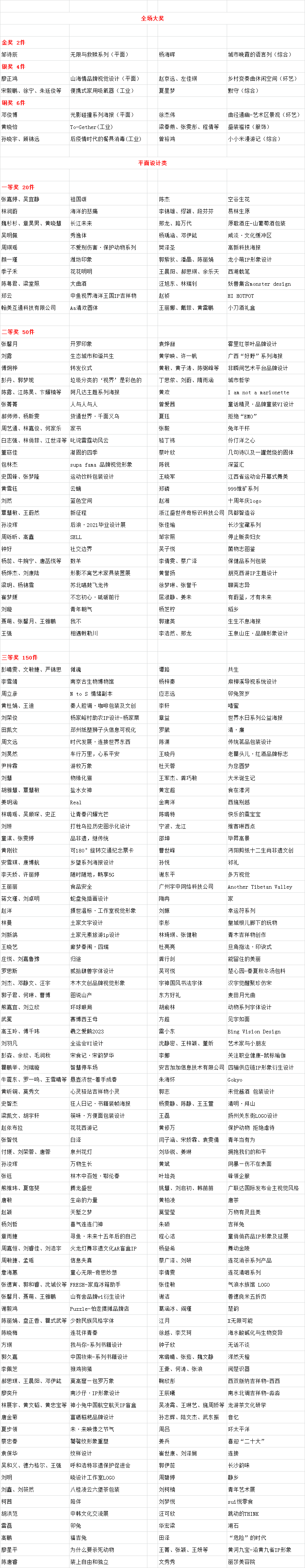 本屆大獎共計收到來自中國內地及港澳臺地區的6322件參賽作品(有效稿件)。注重設計與藝術、科技、生態的結合,堅持多元與融合的標準,本屆大獎最終評出:全場大獎作品共12件;平面設計類一、二、三等獎作品共220件;工業設計類一、二、三等獎作品共130件;環藝設計類一、二、三等獎作品共190件;服飾設計類一、二、三等獎作品共80件;綜合設計類一、二、三等獎獲獎作品共200件;優秀獎作品1164件。本屆大獎等級獎的獲獎率約為13%,優秀獎以上的獲獎率約為32%。
