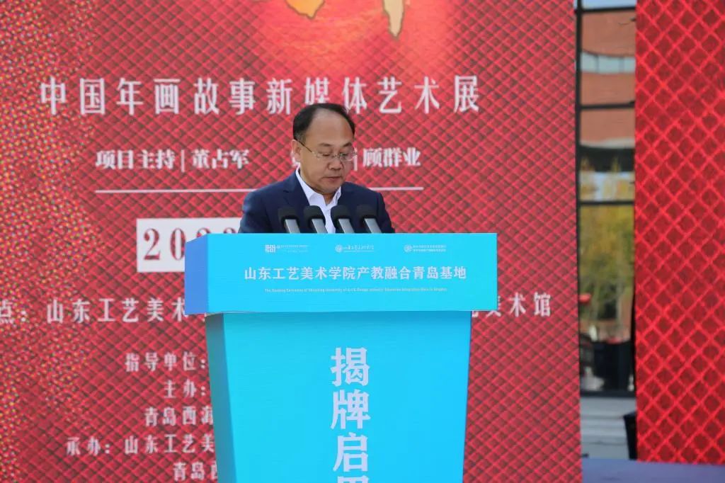 10月11日,由國家藝術基金管理中心指導,山東工藝美術學院和青島西海岸新區文化和旅游局聯合主辦的2023年度傳播交流推廣項目《承古萌新——中國年畫新媒體藝術展》首場展覽在山東工藝美術學院產教融合青島基地開幕。院長董占軍出席開幕式。