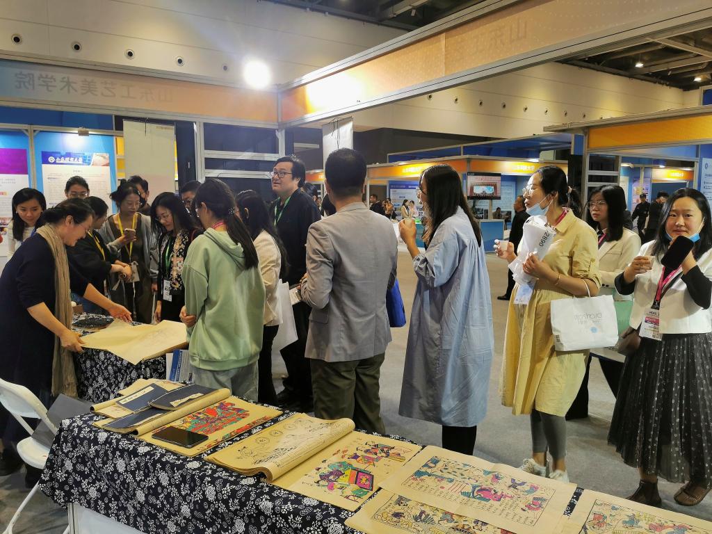 10月12日——14日,由中國高等教育學會主辦,山東省教育廳、青島市人民政府承辦的第60屆中國高等教育博覽會在青島紅島國際會議展覽中心開幕。山東工藝美術學院以國家藝術基金資助項目《承古萌新——中國年畫故事新媒體藝術展》為依托申報的成果展示項目,經山東省教育廳組織篩選,從全省200余所高校中脫穎而出,入選代表山東省杰出教學成果的62個案例之一。學校展位位于第60屆中國高等教育博覽會山東展區中心展區,以其獨特的魅力吸引了大量目光,觀眾絡繹不絕。
