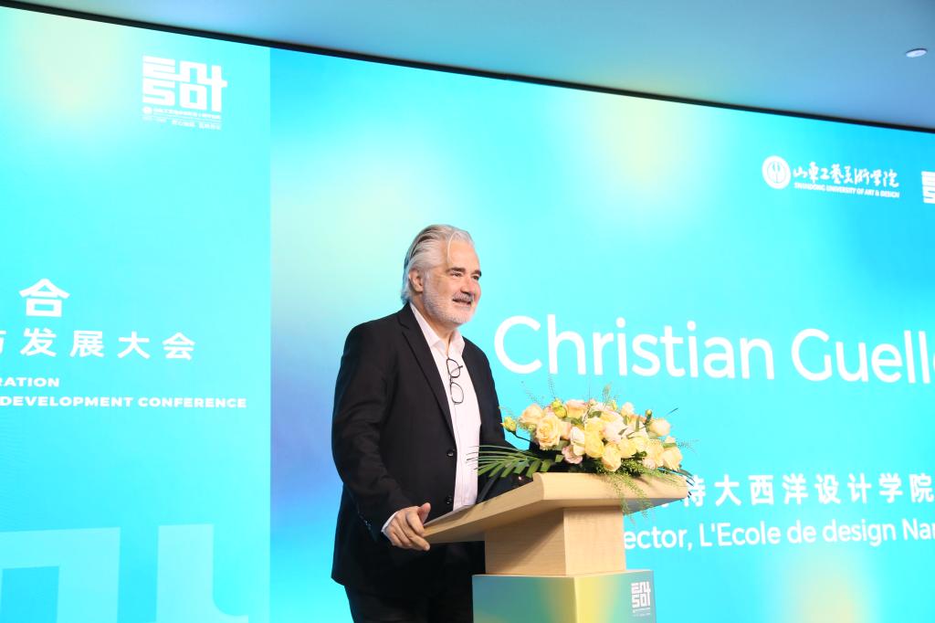 法國南特大西洋設計學院院長克里斯丁·格勒林在致辭中首先感謝山東工藝美術學院的邀請,他表示,早在2008年便與山東工藝美術學院結緣,在學校建校50周年之際,衷心地獻上最誠摯的祝福。他認為,設計是面向未來的,設計師肩負設計未來、探索未來、創造未來的責任和使命。作為一名合格的設計師,必須繼承自己的文化遺產,去傳承自己的文化,發揚自己的傳統。當前我們的設計領域面臨諸多的挑戰,社會的重大變革和人工智能的快速發展,都讓我們從更深層次去思考人類的終極意義,設計的終極意義。設計應該是策略性的戰略性的,設計師不僅僅是設計師,更是戰略家。設計教育工作者,要幫助學生為這些做好準備。
