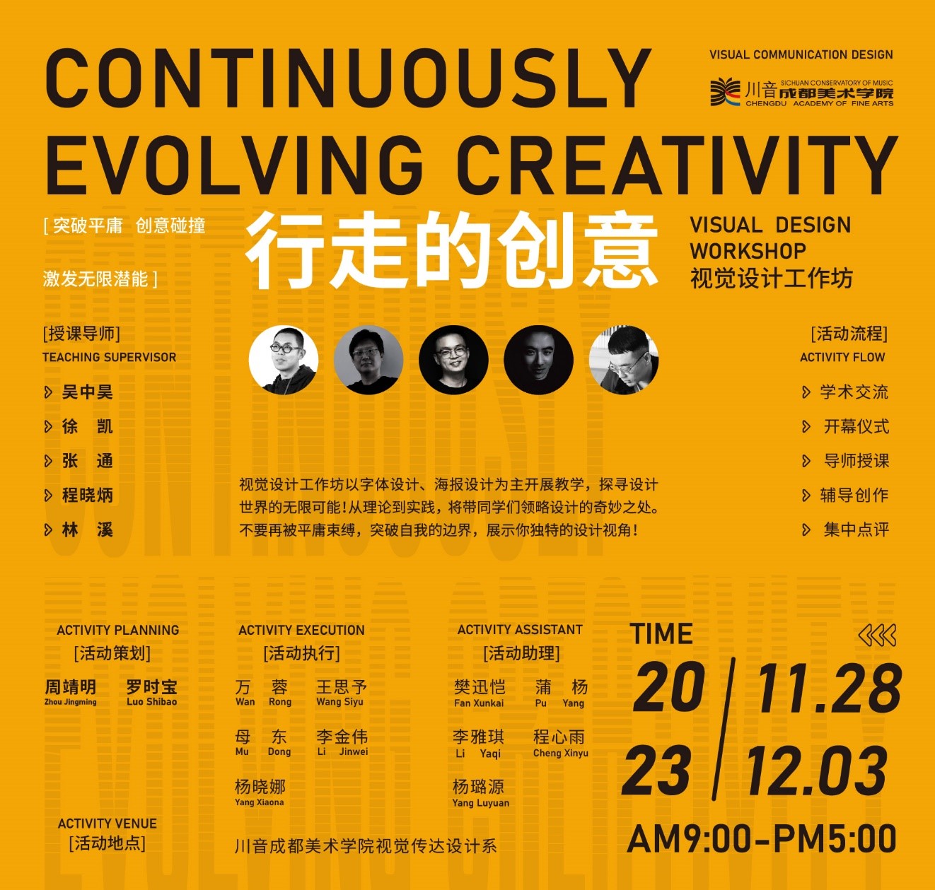 2023年11月29日,由四川音樂學院成都美術學院視覺傳達設計系主辦的“行走的創意”視覺設計工作坊在臨空經濟區校區視覺傳達設計系教學樓成功啟動。四川音樂學院成都美術學院副院長周靖明教授致辭,四川音樂學院成都美術學院視覺傳達設計系教研室主任羅時寶副教授主持啟動儀式。