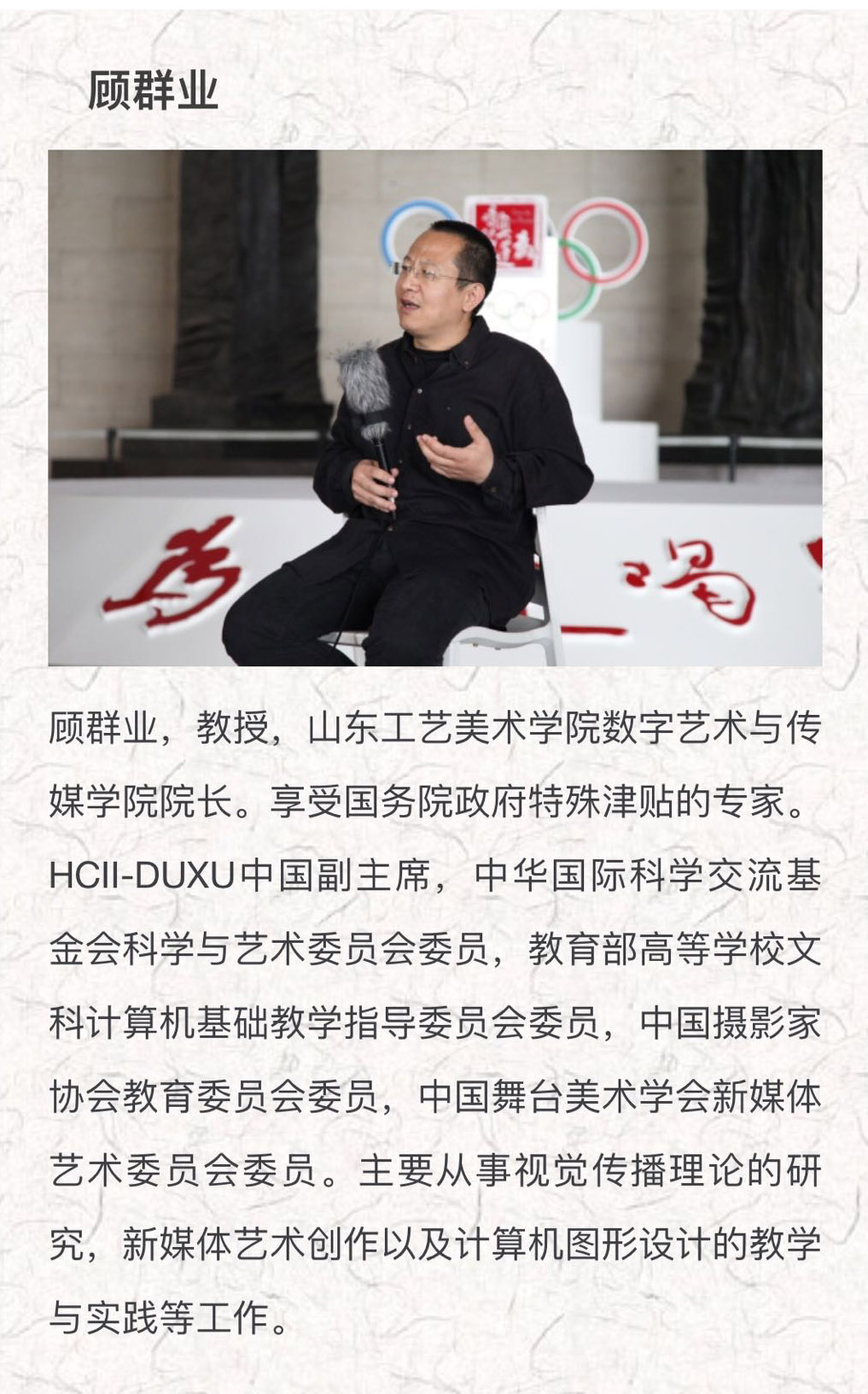 顧群業:奧運設計,包括以奧運會的標志、會徽、吉祥物以及核心圖形等為主題進行創意的衍生產品,是奧林匹克運動理念與價值傳播鏈條上的一環。