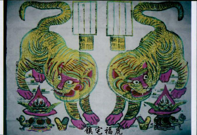 趙國(guó)琦:平陽(yáng)木板年畫取材于當(dāng)?shù)氐牧?xí)俗和傳說故事,木板畫的內(nèi)容主要是些花、鳥、魚和歷史人物。采用夸張生動(dòng)的描寫手法和鮮明的顏色,畫面充滿當(dāng)?shù)氐娘L(fēng)味,反映了當(dāng)?shù)厝嗣窠】怠⒂赂摇⒗寺男愿瘛F疥?yáng)年畫根據(jù)不同的用途有不同的種類。有的懸掛在臥室,有的貼在門窗上,有的則用來(lái)裝飾廚房或桌子。 平陽(yáng)木版畫以戲曲題材為多,這與當(dāng)?shù)貞蚯睒s有關(guān)。戲劇人物畫中人物著戲裝,是根據(jù)舞臺(tái)演出時(shí)摹寫而來(lái),如《黃鶴樓》中,劉備穿蟒系帶躬身向周瑜作揖,周瑜戴紫金盔,插雉尾,穿袍靴,足蹬瓷墩,左手端帶,右手高舉,怒容滿面;趙云穿鎧甲,手抱竹節(jié);東吳兵將則手拿長(zhǎng)矛立于樓口,背后江水滔滔,將那《黃鶴樓》劇中緊張精彩的情節(jié),盡善盡美地刻畫出來(lái)。平陽(yáng)木版畫除了年畫外,還有中堂、屏條、拂塵紙、灶君、門神、天地神畫,以及窗花、燈花等畫。拂塵紙畫俗稱“撲楞紙”,是張貼于炕柜、墻窯、碗架、桌邊的畫,既防塵,又起裝飾作用,故形式都是橫方型。還有紙燈畫,是專為農(nóng)民自制燈籠的張貼畫。
