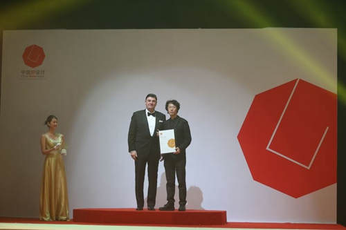(高鳳麟從紅點獎創始人兼主席彼得?扎克教授博士手中接過“中國好設計”金獎獎狀與獎杯)