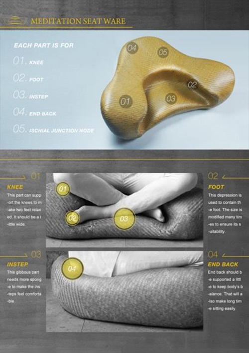 冥想最常見的方式便是盤腿而坐,這樣一種坐姿的好處在于能將身體團圓成一個有機整體,且身體的血液集中于人體上半身,使得臟腑與腦部供血充足,便于集中精力,古人常借這種姿勢以打坐冥想,思考自然萬物存在與關聯的哲理。但是這種坐姿久坐容易血液流通不順暢,導致腿麻而無法繼續。設計師高鳳麟為了讓現代人能夠擁有更為舒適的方式進行冥想,“冥想座具”就此誕生。