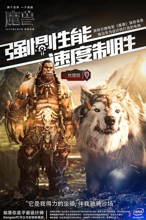 A:我的作品很簡單,介于在主辦方提供的《魔獸》素材上加以合成,并用文案將主題引導至DesignerPC上,體現產品的特質,風格上比較接近《魔獸》電影海報,并能被快速被識別,內容上借杜隆坦與霜狼的協作詮釋速度至上的優越性能,借洛薩與萊恩的配合表現DesignerPC與六代酷睿的完美組合,借奧格瑞姆與毀滅之錘的特質形容DesignerPC的出生不凡,制作精良。