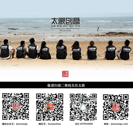 太歌創意胡尊照:濟南太歌廣告有限公司,成立于2009年,至今已經發展6年了。6年來太歌不斷的成長和進步,不斷苛求自己做的更好更完美。至今已經服務了200多家企事業單位。太歌廣告專注于為客戶創造和管理品牌,提供從品牌資產研究、市場洞察、品牌機會分析、品牌戰略、品牌組合規劃、命名和創作、設計(包括品牌識別設計、環境空間文化建設、包裝設計、網絡設計、影視拍攝專題片)到內部品牌導入、品牌管理制度建設的綜合性服務,以提升客戶的品牌影響力。從而更好地提升品牌的市場競爭力和產品銷售力。以文化撬動商業。本公司還致力于為企業建立長期的品牌價值為使命,讓各行業的 品牌形象結合銷售推向市場、占領市場,贏得足夠的社會關注。