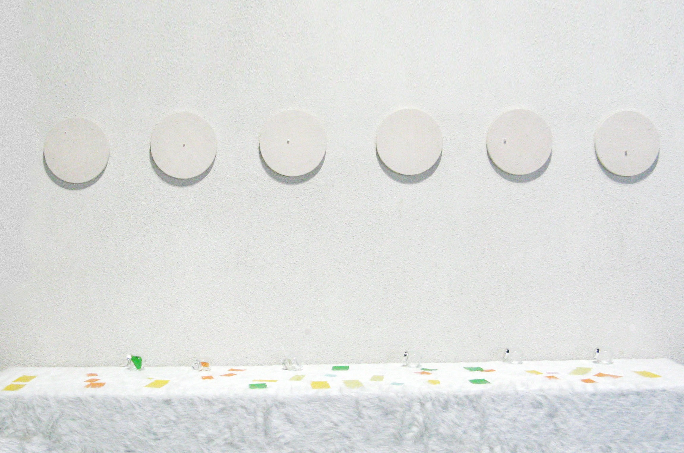 張小娟:在我自己的作品當(dāng)中,說實(shí)話我都喜歡但又都不是特別滿意,我總期待我的下一個(gè)作品可以做的更好。但我有一件作品,其實(shí)更像藝術(shù)作品,我很喜歡。這個(gè)作品在技巧上沒有那么復(fù)雜,是個(gè)簡單的裝置,然后我用了六個(gè)圓形的畫框,這上面本來是繃了油畫布的,我把上面的布都扯下來,我把我媽媽三十年前親手織的一塊原白布(那是她親手紡的,盡管那塊布并不完美,上面還有很多線頭)很仔細(xì)地把它繃到畫框上面,然后在每個(gè)框子上又組合了一個(gè)不同形態(tài)的閃光的珠子,大小不一樣,有銀的,金的,珍珠等等。為什么呢,因?yàn)榱鶄€(gè)點(diǎn)在中文里是省略號(hào)的意思,我就把這個(gè)看起來很簡單的作品(我還寫了很長的一段話,但是沒有一個(gè)標(biāo)點(diǎn)符號(hào))作為我對(duì)母親母愛母性很局促的一個(gè)表達(dá)。我把這件作品掛在展覽廳中很大很重要的一個(gè)位置,給這樣原初質(zhì)樸的感情和質(zhì)感一份尊重。它不復(fù)雜卻是一個(gè)很真誠的作品。