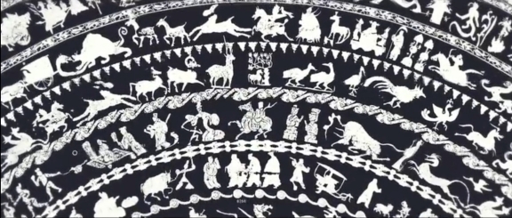 張光帥:我所參展的作品名叫《問道》,這件作品2019年入選了十三屆全國美展,之前也在山東博物館展覽過,本屆雙年展我把它重新拿出來展覽。作品中間是孔子問道老子的一個中心畫面,往外第一圈是春秋時期禮儀、祭祀、包括一些民間的、宮廷的一層一層的圖形,這些圖形都來自漢代的畫像石。隨著圖形的一層層擴散,就像我們的聲音一樣,一層一層地向外擴散,擴散到中層,我又開始找到了一些其他的圖像,比如互聯網符號、航空航天、我們民族的元素、計算機、手機等等的一些工具。隨著這個圈不斷地往外擴散,我們來到了未來,科幻的、夢幻的、甚至說是一些魔幻的東西。再往外,做了一些很模糊的圖像,表示對未來已經超出了我們的認知范圍。那這件作品到底想告訴大家什么呢?我們可以從這個角度來思考:人們所能觀察到能看清的東西,在視覺上是非常震撼的,但我們真的能看懂的,只有生活那三圈,因為這些在咱們這個時代是能認知的。人們對過去的認知只是看著眼熟,里面有一些中國漢代畫像石所刻畫的經典故事,你只是認知了,但并不知道里面的劇情和含義,不知道他造型的意義。對于未來,你不熟悉他,你不認識他,有什么圖形都不知道。生活在我們這個圈,對歷史了解的越多,對未來展望的越好,你的視野才能越開闊,有更開闊的視野,才能獲取更多的知識。