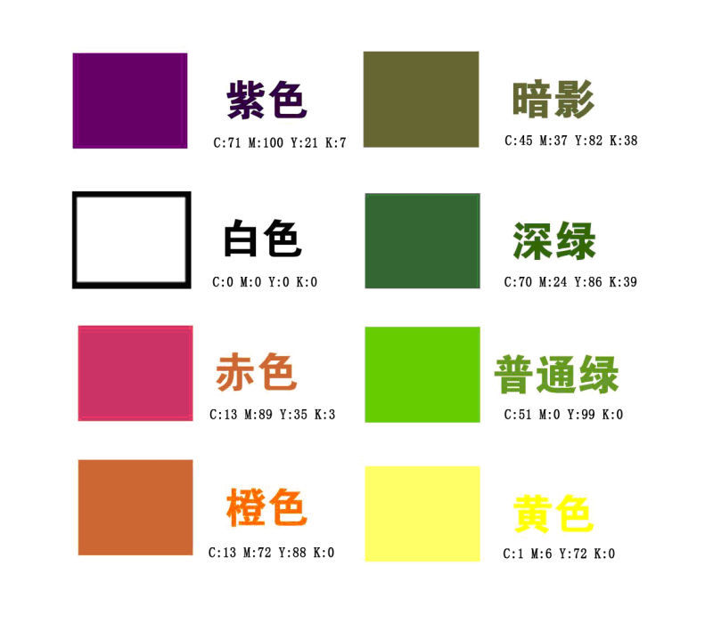 (3)色彩要求:限8種顏色,分別是黃色,紫色,白色,橙色,赤色,深綠,暗影,普通綠色(見(jiàn)圖1,建議寫(xiě)CMYK)