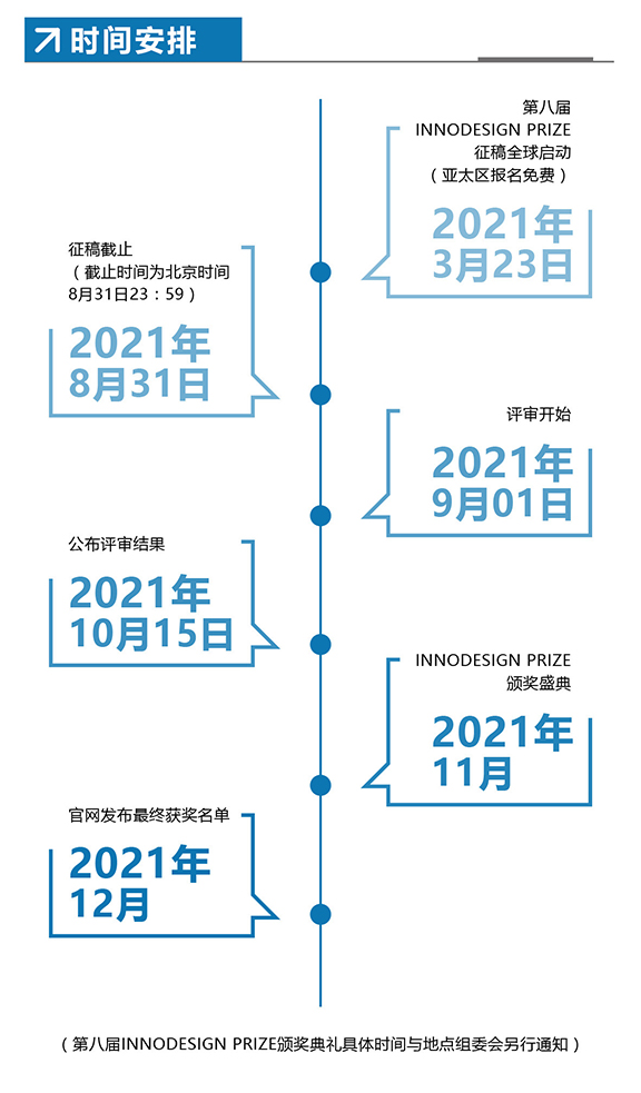 2021年INNODESIGN PRIZE頒獎盛典暫定于2021年11月中下旬舉辦,頒獎盛典期間,主辦方將邀請學(xué)術(shù)委員會成員代表、評審團成員代表、獲獎設(shè)計師及企業(yè)出席。頒獎盛典包括學(xué)術(shù)論壇、主題演講、案例分享及頒獎等環(huán)節(jié)。具體日程主辦方將另行公布。