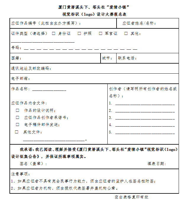 承諾人已充分知曉并自愿接受《廈門黃厝溪頭下、塔頭社“愛情小鎮”視覺標識(logo)設計征集公告》內容(以下簡稱“《公告》”),謹向主辦方承諾如下: