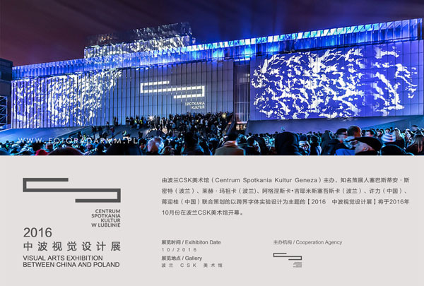 由波蘭盧布林CSK美術館(Centrum Spotkania Kultur Geneza)主辦,知名策展人塞巴斯蒂安·斯密特(波蘭)、萊赫·瑪祖卡(波蘭)、阿格涅斯卡·吉耶米斯塞吾斯卡(波蘭)、許力(中國)、蔣迎桂(中國)聯合策劃的以跨界字體實驗設計為主題的【2016 中波視覺設計展】將于2016年10月份在波蘭盧布林CSK美術館開幕。
