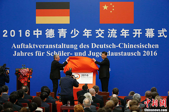 3月21日,中國國家主席習近平與德國總統高克共同出席2016中德青少年交流年開幕式(圖片來自中新網)