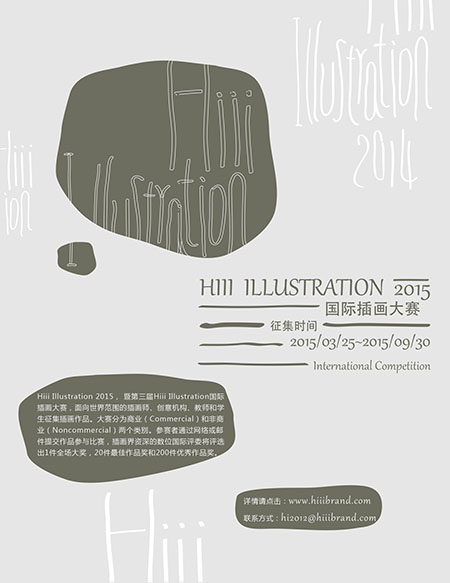 Hiii Illustration 2015,暨第三屆Hiii Illustration國際插畫大賽,由Hiiibrand(嗨!品牌)網(wǎng)站主辦,面向世界范圍的插畫師、創(chuàng)意機(jī)構(gòu)、教師和學(xué)生征集插畫作品。大賽分為商業(yè)(Commercial)和非商業(yè)(Noncommercial)兩個類別。參賽者通過網(wǎng)絡(luò)或郵件提交作品參與比賽,插畫界資深的數(shù)位國際評委將評選出1件全場大獎,20件最佳作品獎和200件優(yōu)秀作品獎。