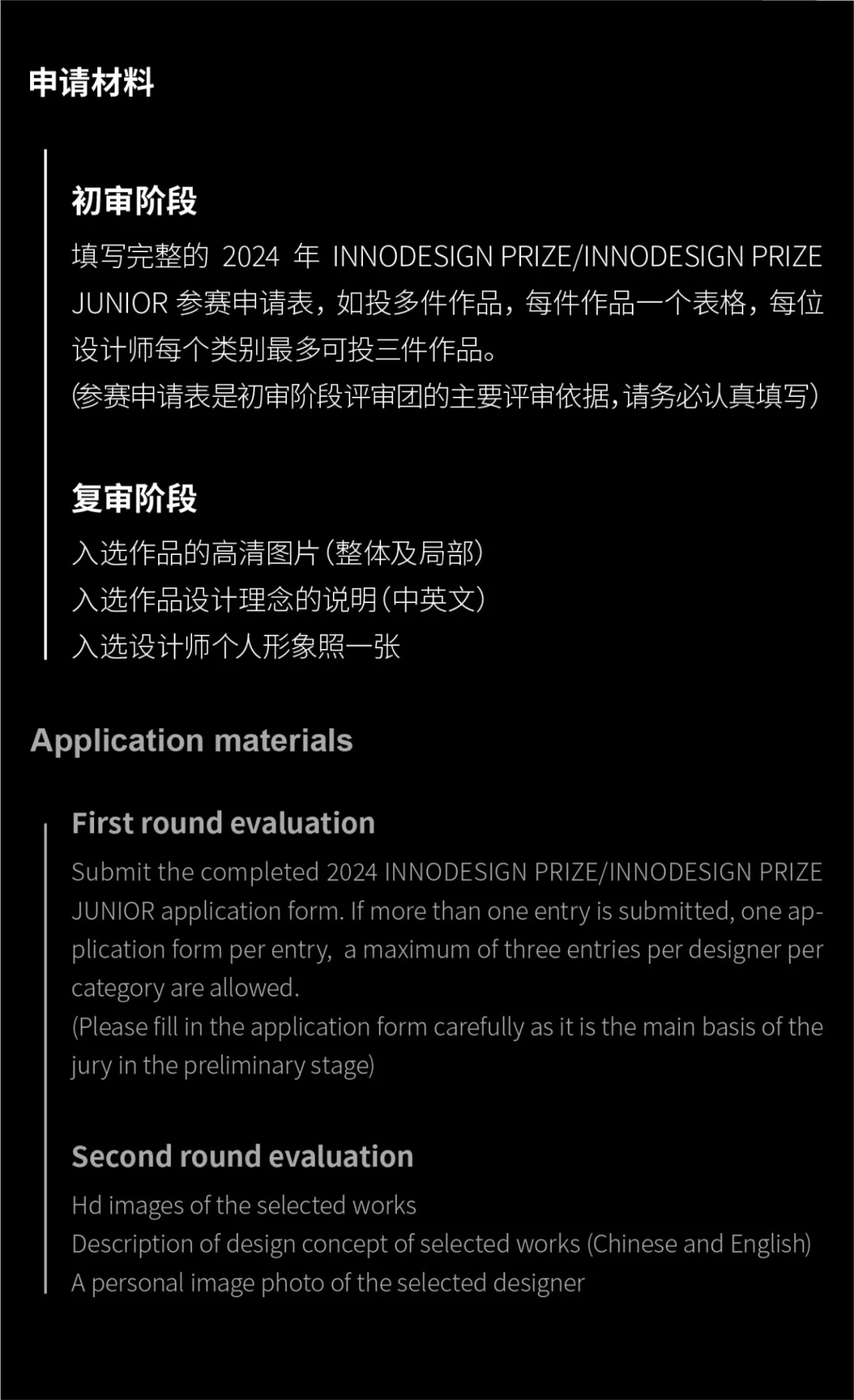 評 審 流 程 所有參賽作品將遞交至INNODESIGN PRIZE專業評審團審核,評審團將從創新、操作、功能、市場需求、外觀、環保及可持續性七個角度對參賽作品進行獨立評分,初審結果將書面通知參賽者。 初審結果分為:未入選通知、提名通知及獲獎通知。總分達到提名分數線的設計師可免費向組委會申請電子版提名證書,總分達到獲獎分數線的設計師將至少獲得INNODESIGN PRIZE或INNODESIGN PRIZE JR.優秀獎獎杯及優秀獎獲獎證書,并進入大賽復審階段,與其他獲獎設計師共同角逐金、銀、銅獎,最終獲獎級別將體現在獲獎證書和獎杯上,復審階段的獎杯及證書需支付相應的費用。 獲獎設計師將受邀出席2024年度INNODESIGN PRIZE全球創新設計大賽頒獎盛典,評審團將于頒獎盛典期間公布最終復審結果及獲獎名單。無法出席頒獎盛典的獲獎設計師,其獎杯和證書將在頒獎盛典結束后,由主辦方統一安排空運運至中國北京辦事處,并由辦事處工作人員安排國內快遞陸續寄送至獲獎設計師。 INNODESIGN PRIZE JUNIOR是針對在校學生、畢業未滿一周年的畢業生專門設立的獎項,評審團將對申報INNODESIGN PRIZE JUNIOR的參賽作品進行獨立評審,旨在挖掘具有潛力的優秀設計生。 Evaluation Process All entries will be submitted to the INNODESIGN PRIZE Professional jury, which will independently score the entries from seven perspectives: innovation, operation, function, market demand, appearance, environmental protection and sustainability. The jury will inform the entrants of the preliminary results in writing. The result of preliminary examination is divided into: notice of failure to be selected, notice of nomination and notice of award. Designers who reach the nominated score can apply to the Organizing committee for electronic nomination certificate free of charge. Designers who reach the winning score will win at least INNODESIGN PRIZE or INNODESIGN PRIZE JR. award and certificate of excellence, and will enter the second stage of the competition and compete for gold, silver and bronze awards together with other award-winning designers. The final award level will be reflected in the award certificate and trophy. The trophy and certificate of review stage will need to pay the corresponding fee. The winning designers will be invited to attend 2024 INNODESIGN PRIZE award ceremony. The jury will announce the final review results and the winners during the ceremony. The trophies and certificates of the winning designers who are unable to attend the award ceremony will be sent by air to the Beijing Office of the organizer after the award ceremony, and the office staff will arrange domestic express delivery to the winning designers. INNODESIGN PRIZE JUNIOR is a special award for students who have graduated less than one year after graduation. The INNODESIGN PRIZE JUNIOR is designed to find outstanding design students with potential through independent judging of the entries submitted by the jury.