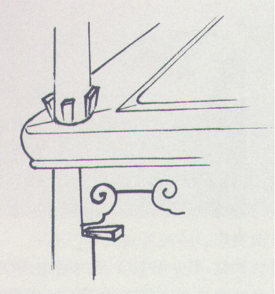 亦稱偏口掛銷。這種掛銷是明清硬木桌類家具腿部與牙板結合部必用的結構。其牢固程度高,不會丟失,配合“抱肓榫”,有較強的抗扭力。桌掛銷有定位準確、可反復拆裝、越打越嚴的特點,便于長途運輸,是蘇、廣及宮廷造辦處硬木桌子上必用的銷子。