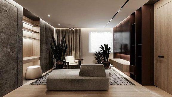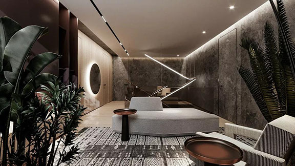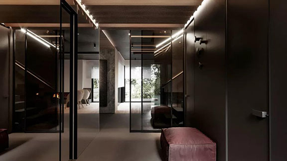 公區(qū)使用了大面積的黑色透明玻璃,為空間融入一絲現(xiàn)代感。鏡面與線型燈管的使用讓整個公共區(qū)開闊通透,讓人感到閑適無壓的生活節(jié)奏與都市氣息并存的生活體驗(yàn)。