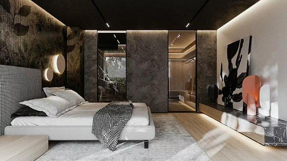 主臥空間中使用簡約內(nèi)斂的高級黑作為主色調(diào)使人沉淀心靈, 淡淡的原木色系是貫穿空間的靈魂,配以舒適溫柔的床品,藝術(shù)壁紙的穿插、融合打破了空間的平淡乏味,每一處都彰顯著居住者優(yōu)雅的生活狀態(tài)與情調(diào)。