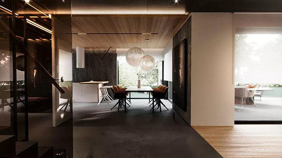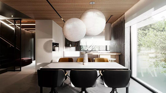 客餐廳空間基調(diào)為中性灰色,餐廳兩個皓月般的圓形吊燈 是對極簡設(shè)計的一種溫柔回應(yīng)。它復(fù)古溫婉,盡顯極簡主義,呈現(xiàn)出簡約、休閑的都市格調(diào)。