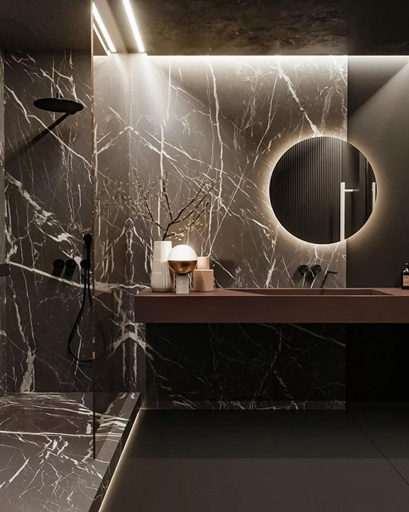 衛(wèi)生間黑色的運(yùn)用,把克制的情緒表現(xiàn)的淋漓盡致,少之不熟,多則“焦”。紅色的適量點(diǎn)綴使得的空間形與色的關(guān)系持續(xù),和諧,完整,一種更純粹的設(shè)計和生活方式被喚醒。