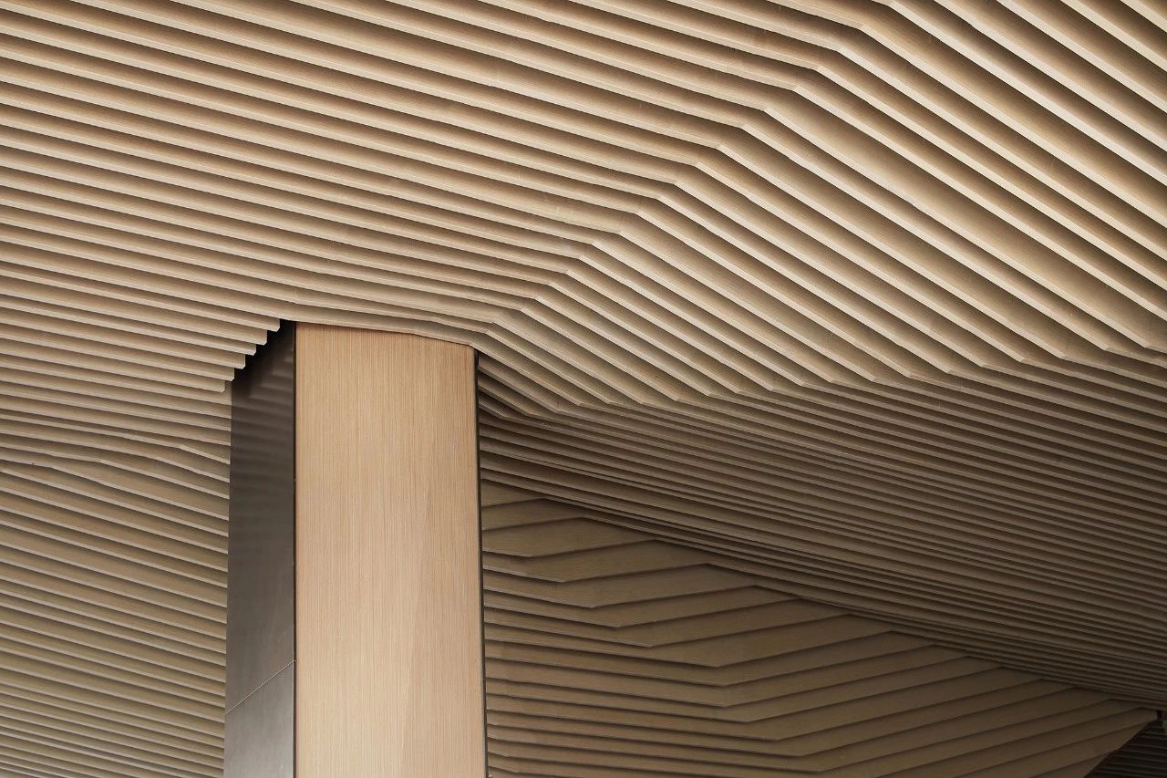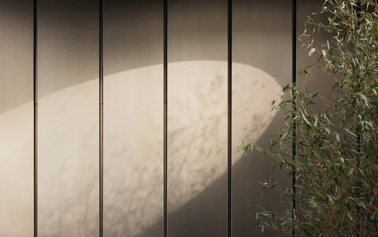 庭者,堂前階也;院者,周坦也。建山水,植松竹,依軸為序歸置山水動線。長幅潑墨山水畫卷圍合起建筑與堂前朗闊之地,山石水景各有逸趣,又富于形、歸于道,重置當代語境下的東方文化認同感。云紋墻面上雕鏤的半透屏風圓融雅正,以金屬穿孔板為材,在漏景中定格流云紋樣,勾勒出輕靈入勝的美學意涵。