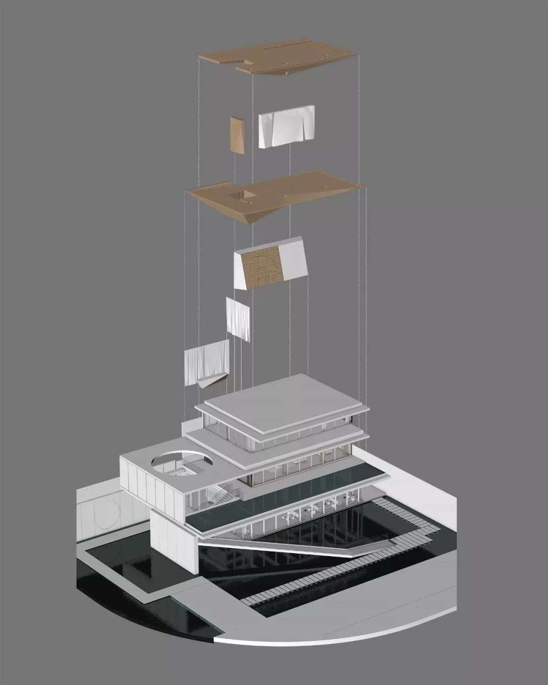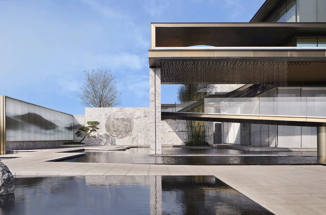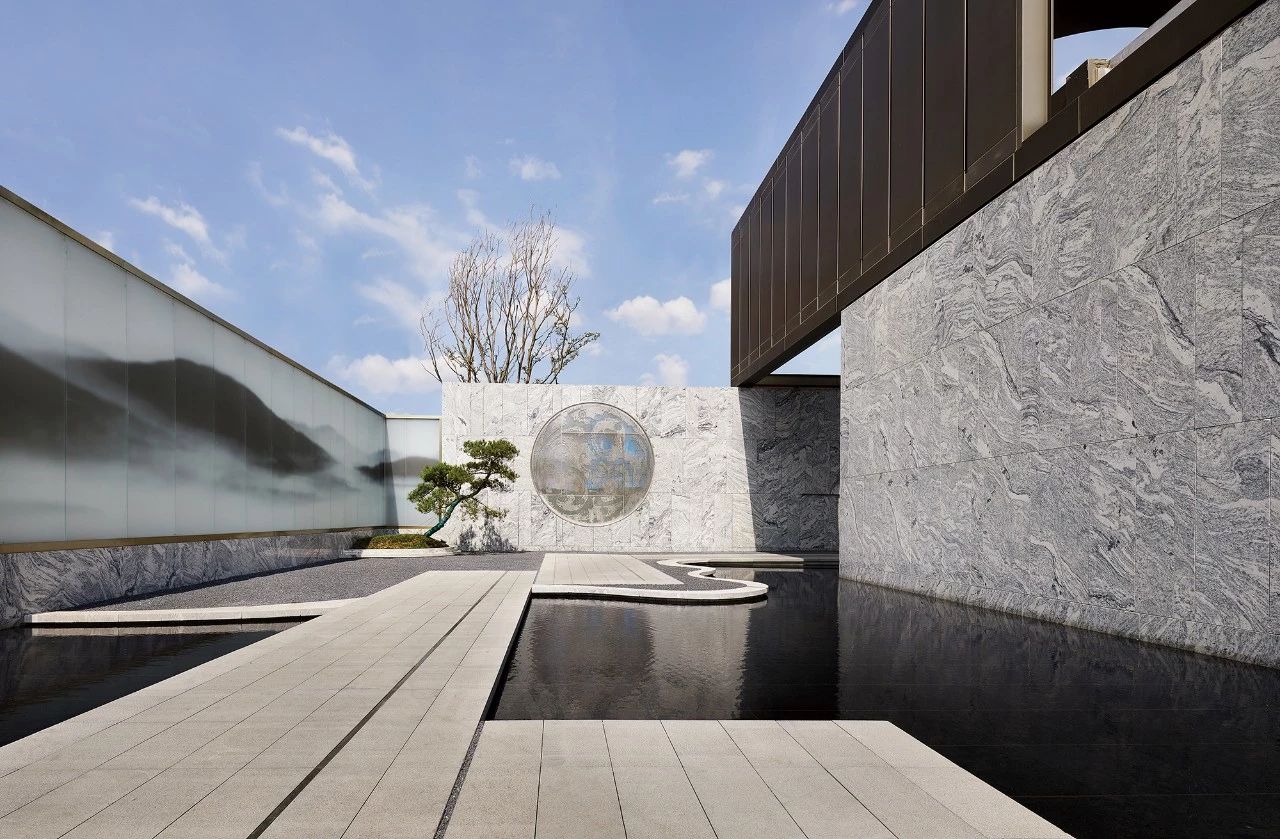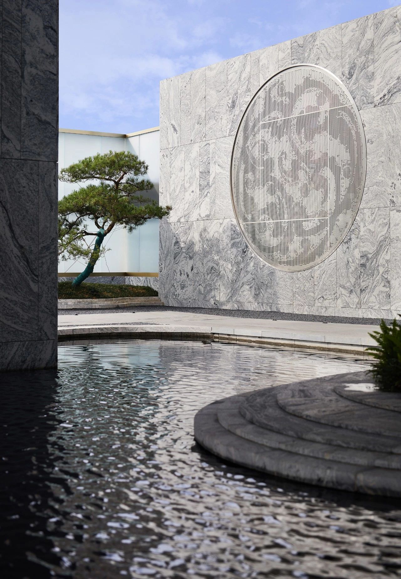 水景的回環動線以建筑為圓心視點,經由石階周折引入,設計所要傳遞的東方隱逸層層遞進,曲徑縱深,流水潺潺。于方圓之間,造物,造景,亦造境。檐側落雨簾,大珠小珠渾然歸一,又周而往復,激起點點漣漪,回旋在空濛的意境之中。