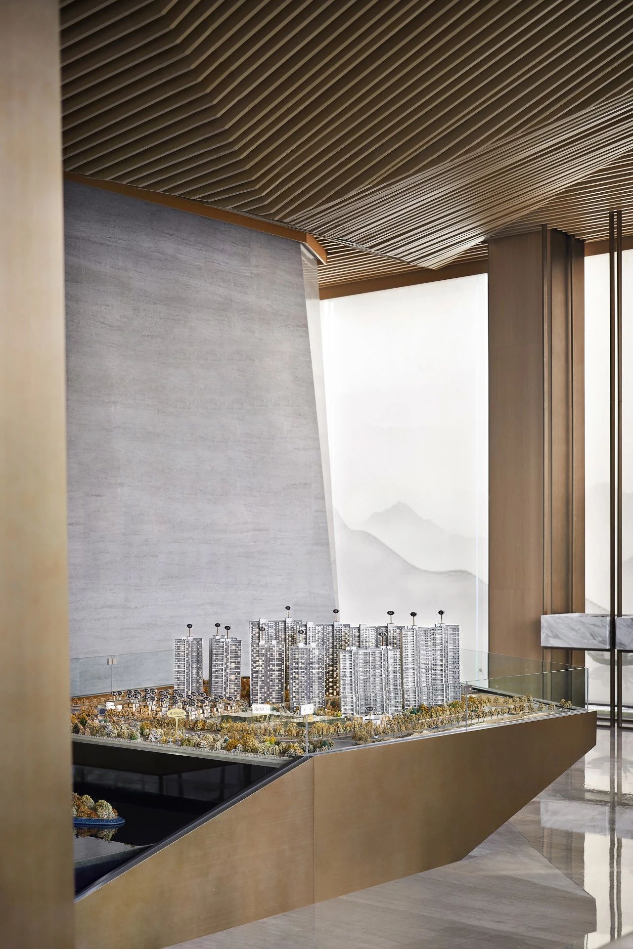 沙盤區軒然朗闊,幾何塊狀的疊加,運用于沙盤底座,延續了端秀而雅正的秩序感,與層次分明、疏密有致的木藝天花相映成趣,銜接起峰巒百轉、嵐煙迂濛的畫意詩情,于溫煦淡雅的氛圍中,一探空間的境中深蘊。